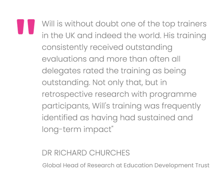 He's been described as a "Maestro of Coaching" (Geoff Barton, The TES) and "One of the best trainers in the country, and probably the world" ~ Richard Churches, Global Head of Research, Education Development Trust